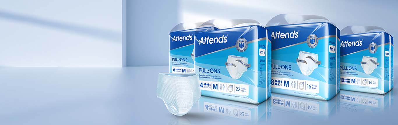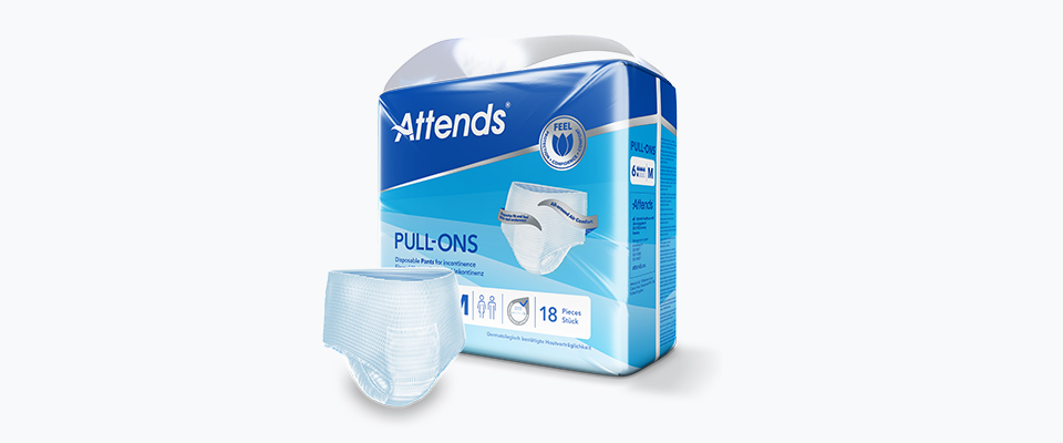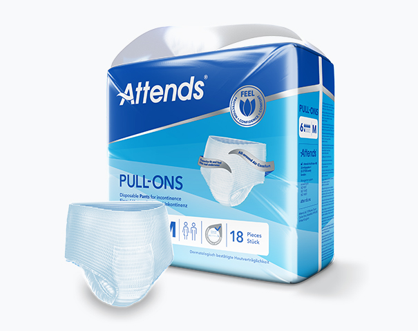 Attends Pull-Ons sind weiche, diskrete und saugstarke Einmalhosen, die sich wie Unterwäsche anfühlen. Sie sind für leichte, mittlere oder schwere Inkontinenz geeignet.